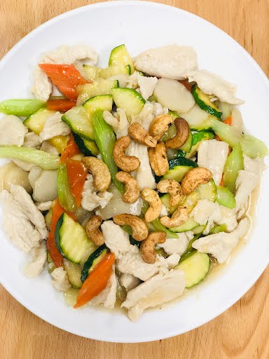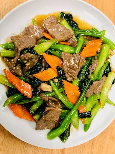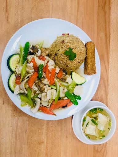 Broccoli, carrots, and choice of protein. Served with steamed jasmine rice